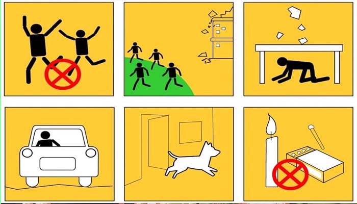 শিক্ষাপ্রতিষ্ঠানে অবস্থানকালে স্কুলব্যাগ মাথায় দিয়ে শক্ত বেঞ্চ অথবা শক্ত টেবিলের নিচে আশ্রয় নিন।