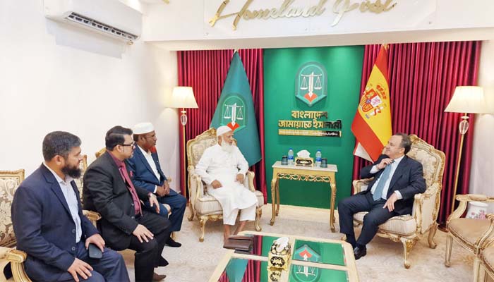 আজ রোববার রাজধানীর বসুন্ধরার কার্যালয়ে জামায়াত আমির শফিকুর রহমানের সঙ্গে স্পেনের রাষ্ট্রদূত ও ইউরোপীয় ইউনিয়নের নির্বাচন পর্যবেক্ষণ মিশনের প্রতিনিধিদলের আলাদা দুটি বৈঠকে নতুন লোগো দেখা যায়।