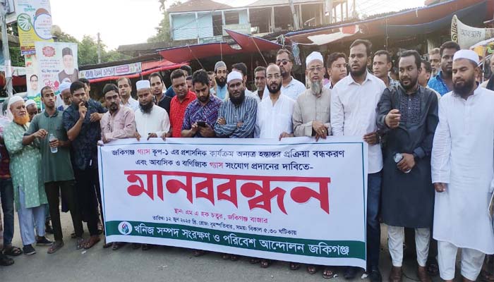 সিলেটের জকিগঞ্জ গ্যাস কুপ-১ এর কার্যক্রম অন্যত্র হস্তান্তর বন্ধকরণ এবং আবাসিক ও বাণিজ্যিক গ্যাস সংযোগ প্রদানের দাবীতে মানববন্ধন অনুষ্ঠিত হয়েছে।