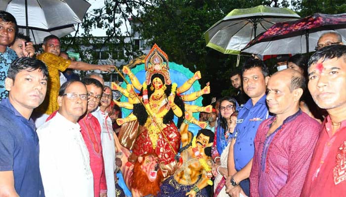 গুড়ি গুড়ি বৃষ্টি উপেক্ষা করে ও ঢাক, ঢোল আর বিভিন্ন বাদ্যযন্ত্রের তালে তালে পৌর শহরের বিভিন্ন সড়কে দেবী দুর্গার প্রতিমা নিয়ে শোভাযাত্রার মধ্য দিয়ে বাসিয়া নদীতে প্রতিমা বিজর্সনের জন্য উপজেলা পরিষদের ঘাটে আসেন বিভিন্ন মন্ডপের নেতৃবৃন্দ। বৃহস্পতিবার (২ অক্টোবর) বিকেলে বাসিয়া নদীর উপজেলা পরিষদ ঘাটে প্রতিমা বিসর্জনের উদ্বোধনী অনুষ্ঠানে প্রধান অতিথির বক্তব্য রাখেন উপজেলা পরিষদের প্রশাসক ও উপজেলা নির্বাহী কর্মকর্তা (ইউএনও) সুনন্দা রায়। এসময় প্রশাসনিক, আইন শৃঙ্খলা বাহিনী, সাংবাদিক, সনাতন ধর্মালম্বীদের বিভিন্ন সংগঠনের নেতৃবৃন্দ উপস্থিত ছিলেন।