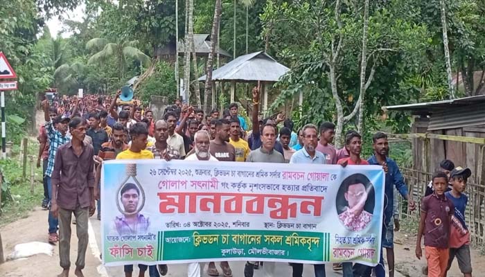 মৌলভীবাজারের কুলাউড়ায় চা-শ্রমিক সর্দার হত্যার অভিযোগে আটক গোলাপ সৎনামের ফাঁসির দাবিতে উত্তাল হয়ে উঠেছেন ক্লিভডন চা-বাগানের শ্রমিকরা।
