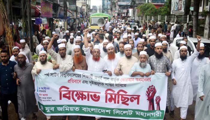 নর্থ-সাউথ বিশ্ববিদ্যালয়ের ছাত্র অপূর্ব পালের দৃষ্টান্তমূলক সর্বোচ্চ শাস্তি, ফাঁসি এবং অবিলম্বে ব্লাসফেমি আইন কার্যকর করার দাবিতে যুব জমিয়ত সিলেট মহানগর শাখার উদ্যোগে আজ নগরীতে এক বিশাল বিক্ষোভ মিছিল ও সমাবেশ অনুষ্ঠিত হয়েছে। পবিত্র কোরআন অবমাননার প্রতিবাদে আয়োজিত এই কর্মসূচিতে বক্তারা অপূর্ব পালের কঠোর শাস্তির দাবি জানান এবং ধর্ম অবমাননা রোধে ব্লাসফেমি আইন প্রণয়নের ওপর জোর দেন।