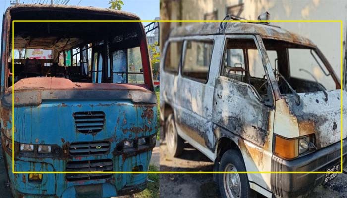 সিলেটে দুর্বৃত্তদের আগুনে পুড়ল অ্যাম্বুলেন্স ও বাস