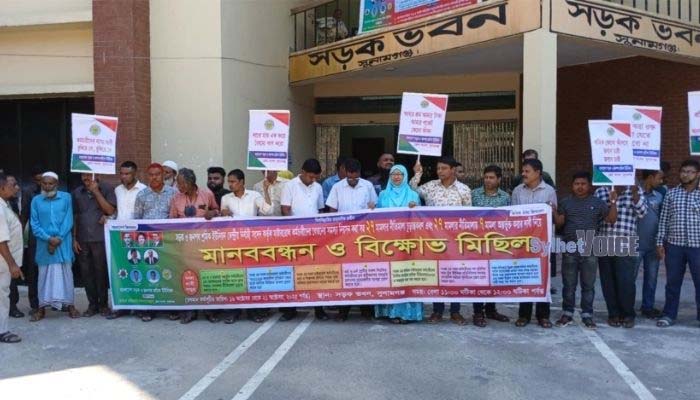সুনামগঞ্জে সাত দফা দাবিতে সওজ কর্মচারীদের মানববন্ধন