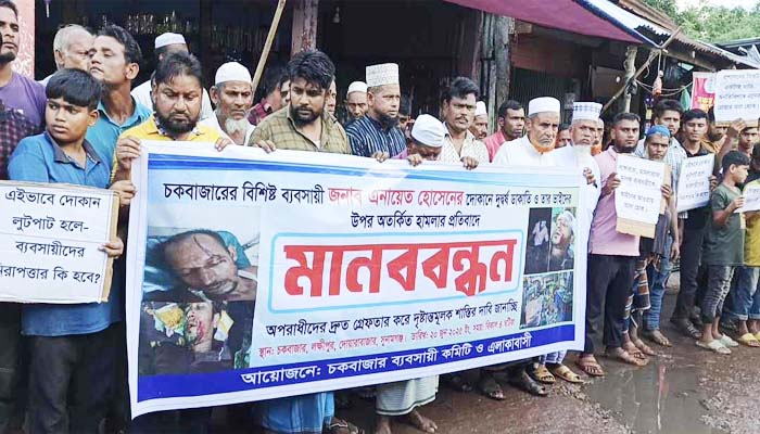 দোয়ারাবাজারে ব্যবসায়ীর উপর হামলার প্রতিবাদে মানববন্ধন