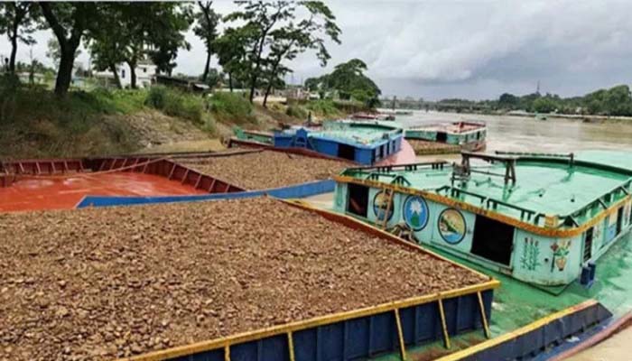 সুরমা নদী থেকে পাথরবোঝাই ৯টি নৌকা আটক করে পুলিশে দিল জনতা