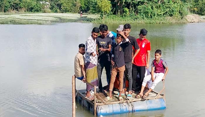 জামালগঞ্জে বেলায় চড়ে ঝুকি নিয়ে পারাপার হয় শিক্ষার্থী ও পথচারীরা