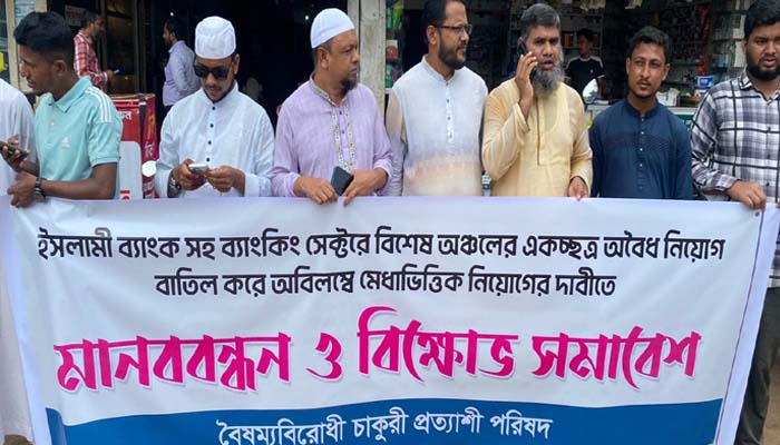 ইসলামী ব্যাংকের অবৈধ নিয়োগ বাতিলের দাবিতে কুলাউড়ায় মানববন্ধন
