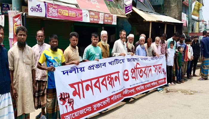 শান্তিগঞ্জে জোরপূর্বক জায়গা দখলের প্রতিবাদে মানববন্ধন
