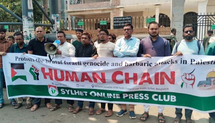 ফিলিস্তিনে গণহত্যার প্রতিবাদে সিলেট অনলাইন প্রেসক্লাবের মানববন্ধন