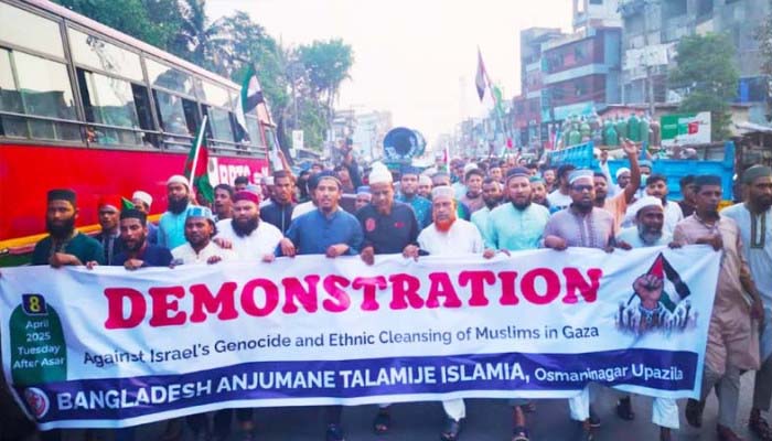 গাজায় গণহত্যার প্রতিবাদে ওসমানীনগরে তালামীযে ইসলামিয়ার বিক্ষোভ মিছিল