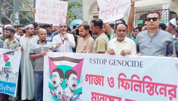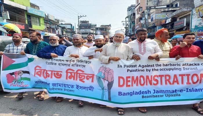 জামালগঞ্জে ইসরায়েলি আগ্রাসনের প্রতিবাদে অর্ধ দিন দোকান বন্ধ ও বিক্ষোভ