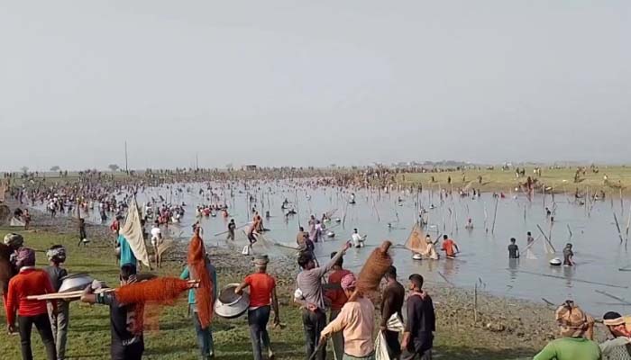 সুনামগঞ্জে পুলিশের সামনেই মাইকে ঘোষণা দিয়ে বিল থেকে মাছ লুট