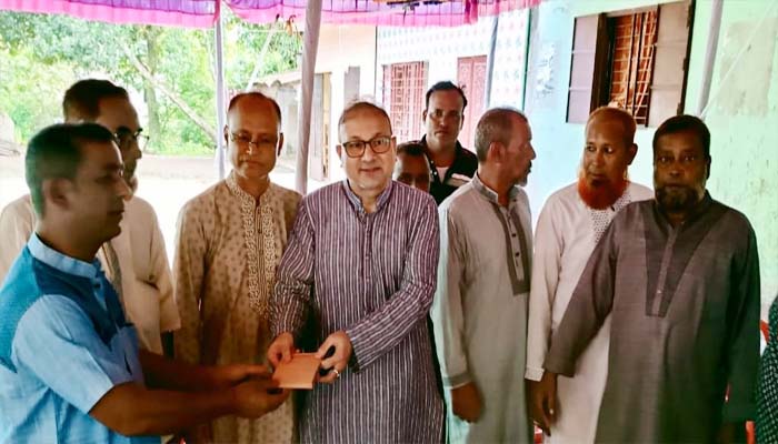 শান্তিগঞ্জে ব্যারিস্টার আনোয়ার হোসেনের পূজামণ্ডপ পরিদর্শন ও অনুদান বিতরণ