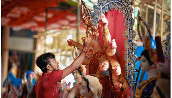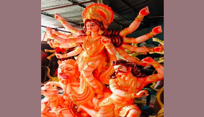 শেষ মুহুর্তে রঙ তুলির ছোঁয়ায় সেজে উঠছেন দেবী ত্রিনয়নী দশভূজা